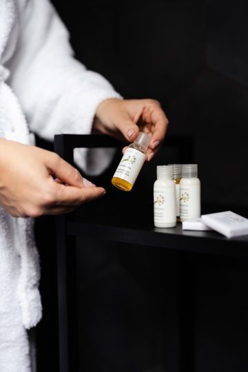 - Koupelna – ručníky, příručníky a osučka, župan a pantofle, kosmetika a toaletní potřeby, mýdlo a šampon, fén