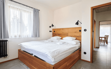 ... a k tomu samostatná ložnice s komfortní manželskou loží, plně vybavená kuchyně, pohodlné sofá. Apartmá vhodné jak pro líný výlet ve dvou, tak po rodinný výjezd s malými svišti (je tu na ně totiž dostatek místa, ať už s přistýlkou, tak s postýlkou). Hodně světla, vzduchu a klidu.